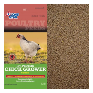 Feed free choice to growing chicks from 8 to 18 weeks of age. Keep feeders clean and provide a source of fresh, clean water at all times. At 18 weeks of age, begin feeding Lone Star 17% All Mash Pellets (code 1153).